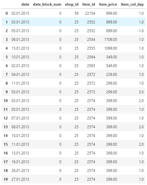 日付、店舗ID、商品ID、商品価格、販売数量とdate_block_num(2013/01を0とした月毎の連番)。データ件数は2,935,849件です。販売数量は返品があった場合マイナスになっているようです。