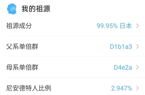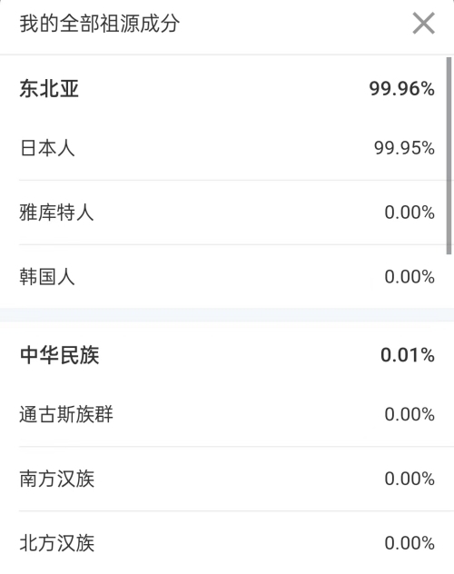 祖先成分結果を見ると、99.95%日本人のDNA。
