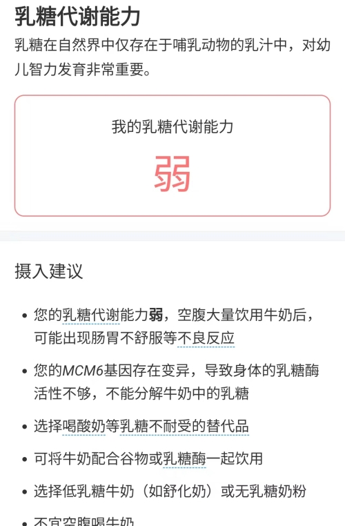 MSM6遺伝子に変異があり、乳糖分解酵素の活性が低下していて牛乳の乳糖を分解できないとのこと。調べてみると日本人の90%程度は乳糖不耐症との報告もあるので特に気にすることは無さそうです。