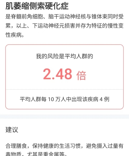 筋萎縮性側索硬化症(ALS)のリスクは2.48倍とありますが、10万人に4人程度しか発症しない病気なので2倍のリスクでも気にする必要はなさそうです。