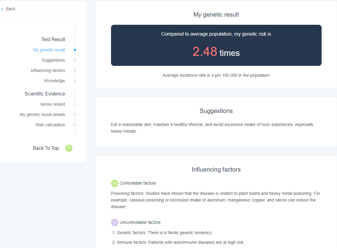「■■番染色体DNAのどの位置の塩基配列が〇〇なので高リスク」等が詳細に記載されています。このリスク計算は、主にアジア人のサンプルが使用されています。